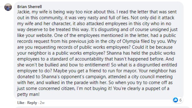 Second, why is he calling me out about my public records request with the City of Olympia (he states “employees”, but it’s only one employee) like it’s a bad thing. They are allowed by law, and anyone who supports transparency should support them. Also, who told him about my request? I can think of only two people: his wife or Mr. Sloan. And why does my request appear to personally bother him?
